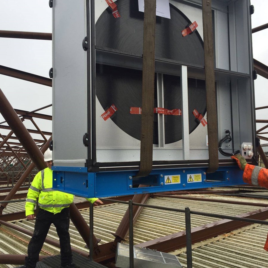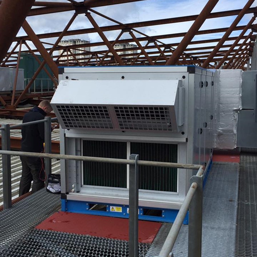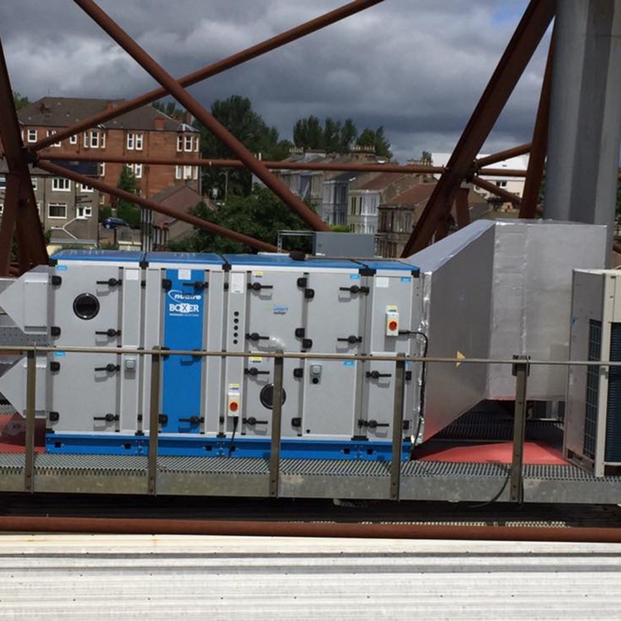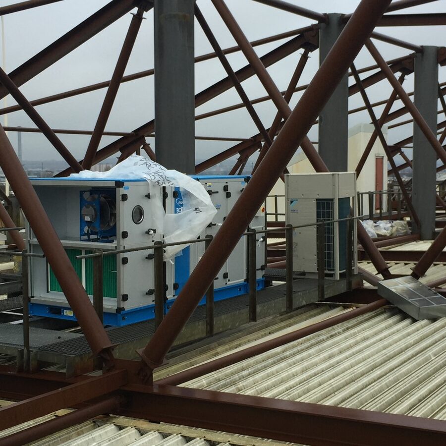 A highlight of this project was the challenge of the installation of 2nr New Air Handling Units, and AC Condensers, which required careful logistics of being lifted onto the roof of the stadium. All of which was a success on a cold winters morning.